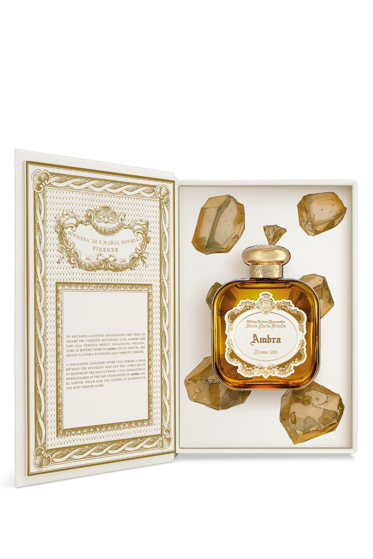 A fascinating olfactory story that forges a bond between the enigmatic East and the citrus fruits so beloved by the Medici family. A collaboration as irreplaceable as the raw ingredients of Ambra Eau de Parfum, which link the history of Florence to the most remote lands.